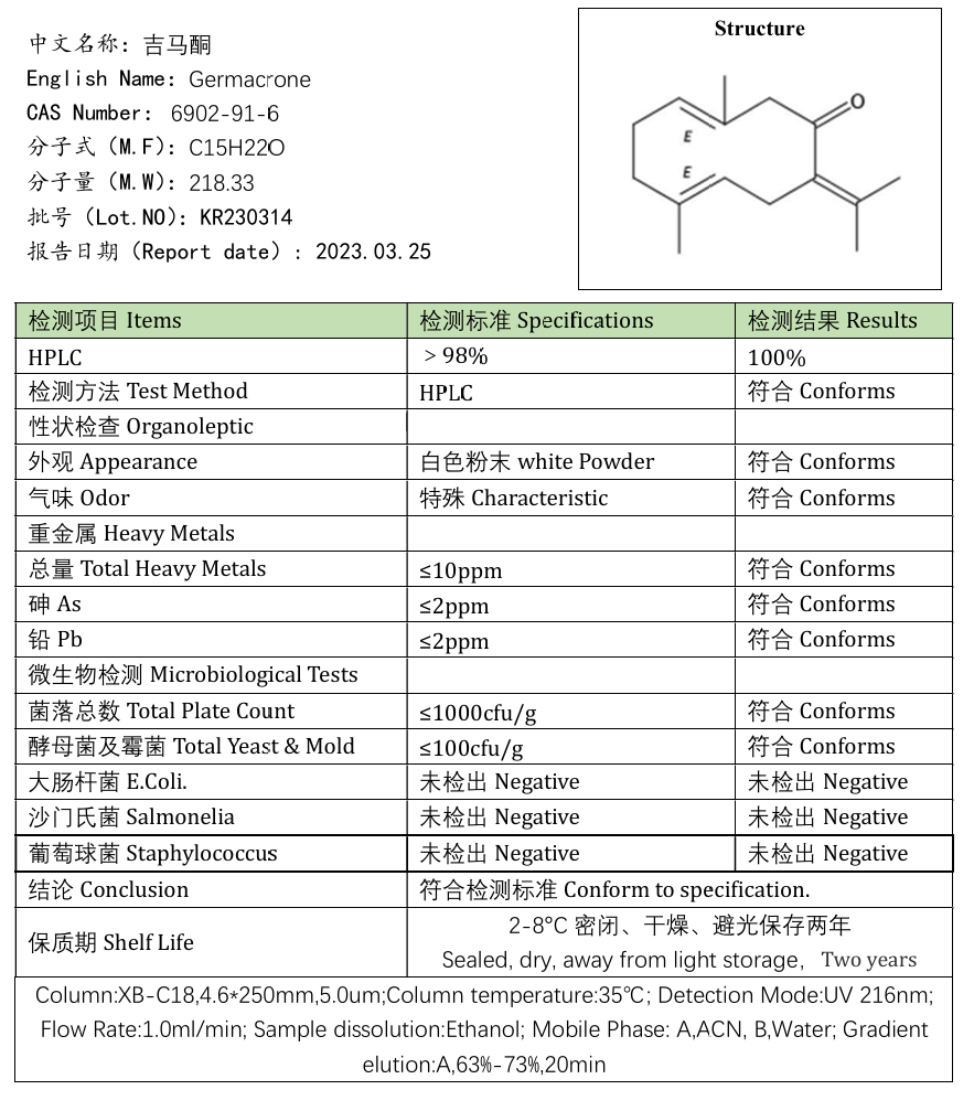 中文別名 吉馬酮;(E,E)-大牻牛兒-3,7(11),9-三烯-6-酮;(E,E)-3,7-二甲基-10-(1-甲基亞乙基)-3,7-環(huán)癸二烯-1-酮;吉馬酮 標(biāo)準(zhǔn)品;吉馬酮(標(biāo)準(zhǔn)品);吉馬酮,Germacrone,植物提取物,標(biāo)準(zhǔn)品,對(duì)照品;吉馬酮;Germacrone;吉馬酮對(duì)照品;牻牛兒酮;吉馬酮;(E,E)-大牛兒-3,7(11),9-三烯-6-酮;大根香葉酮;吉馬酮(大根香葉酮,牻牛兒酮,杜鵑酮);吉馬酮;牻牛兒酮;杜鵑酮;牻牛兒酮;(3E,7E)-3,7-二甲基-10-(丙-2-亞基)環(huán)癸-3,7-二烯酮;反,反-3,7-二甲基-10-異亞丙基-3,7-環(huán)癸二烯-1-酮;(E,E)-吉馬-3,7(11),9-三烯-6-酮