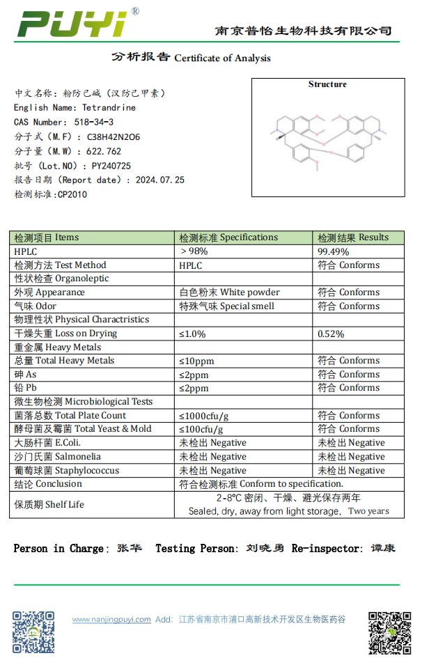 中文別名:粉防己堿;漢防己甲素